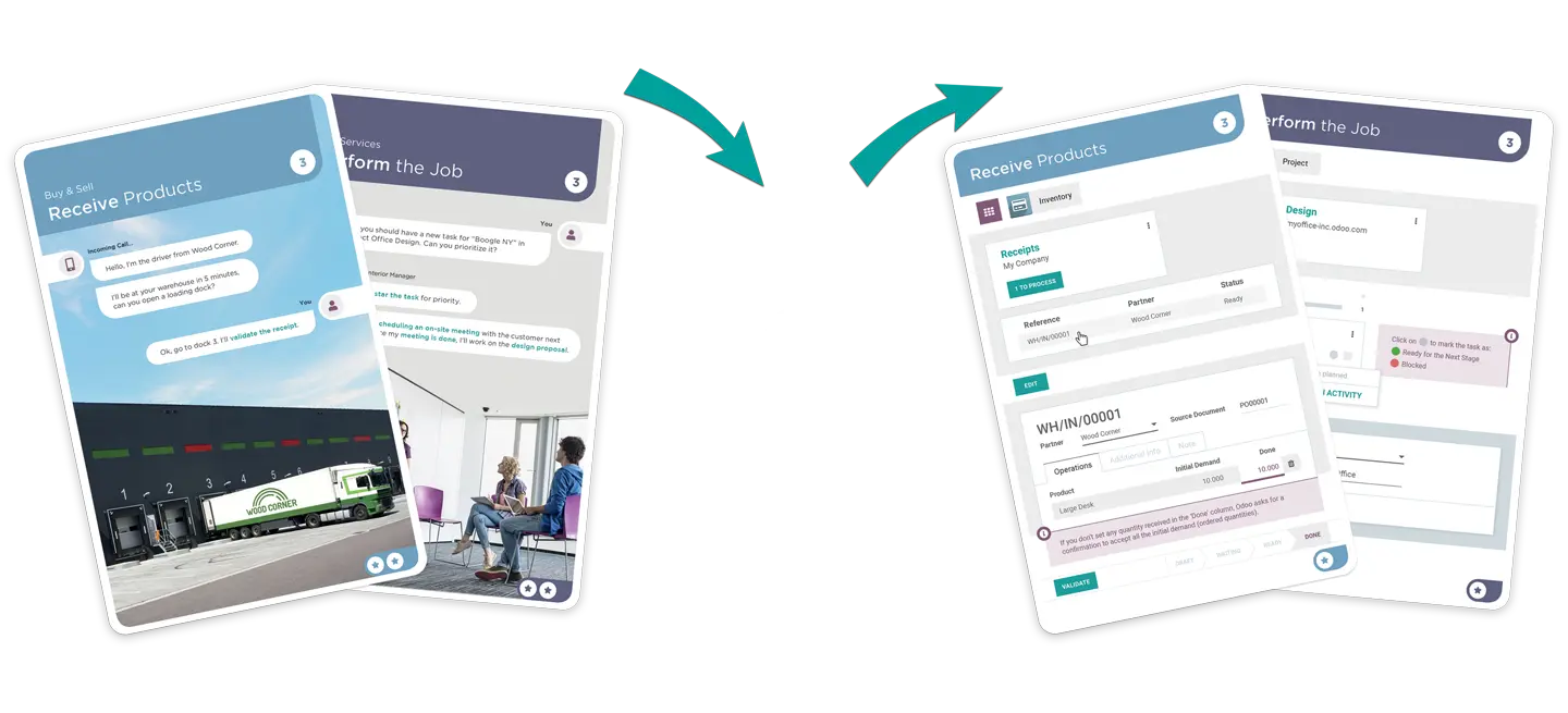 Scale up beinhaltet 7 verschiedene Business Cases bzw. Geschäftsfälle, welche es zu bewältigen gibt. Eine Karte hat immer eine Vor- und Rückseite. Auf der Vorderseite ist ein Geschäftsvorfall in Form eines Chats abgebildet. Auf der Rückseite findet sich die Lösung für die Umsetzung in Odoo.