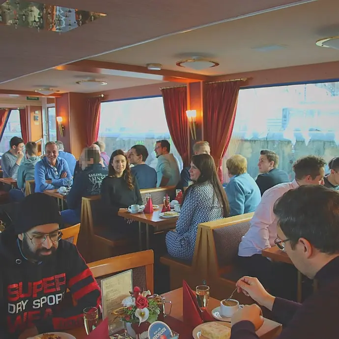 Nach der Ankunft in Rostock haben wir uns dann staunend unser neues Büro angeguckt. Kurze Zeit später befanden wir uns dann bereits auf See. Für ca. 2,5 Stunden konnten wir die Aussicht genießen und uns während einer Kaffee und Kuchen Pause weiter unterhalten, während wir uns dem Hafen näherten.