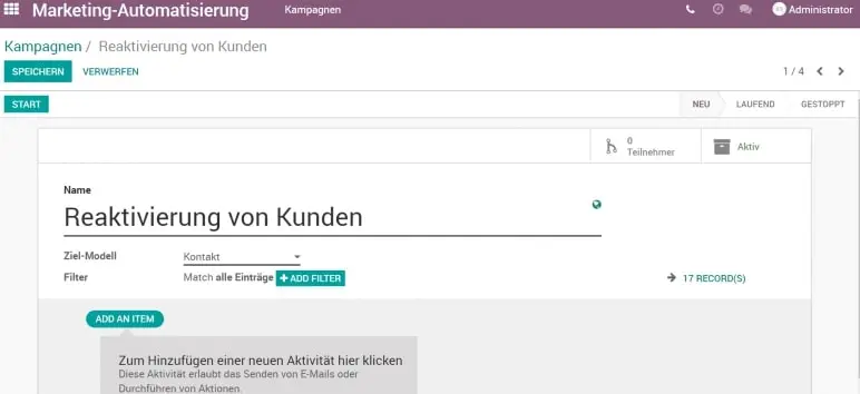 Der Name ist ein wenig irreführend, denn Sie können neben zielgerichteten Kampagnen, z. B. einleitende E-Mails beim Anmelden an Leads oder Rabattmails an bestehende Kunden, auch automatisierte Zahlungserinnerungen (Odoo-Finanzbuchhaltung) oder Buchungsbestätigungen (Odoo-Eventmanager) versenden. Die App dient folglich vorrangig zum Versand von automatisierten E-Mails. Es können aber ebenfalls automatisierte Aktionen, wie beispielsweise im Bereich CRM die Bewegung eines Leads in Ihrem Verkaufstrichter, ausgeführt werden. Man könnte die App also auch als Odoo Business Automatisierung bezeichnen.