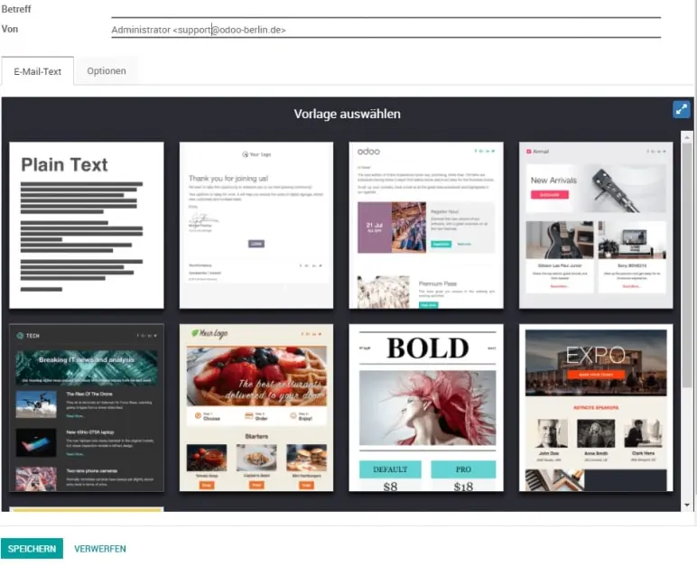 Anschließend wird die Aktivität festgelegt, in diesem Fall eine E-Mail. Anschließend nutzen Sie die „E-Mail-Vorlage“. Die Bezeichnung der Aktion und der Vorlage sollten wieder kurz und markant sein. Wenn sie eine neue Vorlage anlegen und bearbeiten, sehen Sie die Betreff- und die Absender-Zeilen und die Template-Vorlagen von Odoo.