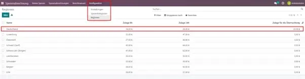 Ist der Spesensatz angelegt, kann ab dieser Stelle im normalen Odoo-Workflow zur Erstellung eines Spesenberichts inklusive Freigabe, Buchung und Überweisung fortgefahren werden. Da die Pauschalsätze je Reiseregion differieren beziehungsweise sich auch ändern können, steht im Modul eine einfache Steuerungstabelle mit den jeweiligen Pauschalsätzen bereit: