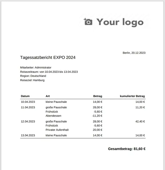 - abzgl. Frühstück 12.04. (20 % der großen Pauschale 28,00 €): -5,60 €
