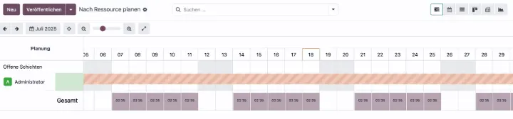 Zu Jahresbeginn wurden Projekte initial den Mitarbeitenden zugeordnet. Die Zuweisung erfolgt direkt in Odoo Planung durch das Erstellen von Schichten im Gantt-Diagramm. So entsteht eine erste Grobverteilung der Kapazitäten.