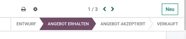 Das Status-Bar-Widget in Odoo ist ein leistungsstarkes Tool zur Visualisierung von Fortschritten und Prozessschritten in verschiedenen Workflows. Es zeigt dem Nutzer klar und übersichtlich an, in welchem Stadium sich ein Vorgang gerade befindet, beispielsweise bei Bestellungen, Rechnungen oder Projekten. Jeder Schritt im Workflow wird als Segment in der Statusleiste dargestellt, wodurch der Nutzer sofort erkennt, welche Aufgaben bereits abgeschlossen sind und welche noch anstehen. Dies verbessert nicht nur die Transparenz, sondern erleichtert auch die Navigation durch komplexe Vorgänge und sorgt für einen reibungslosen Ablauf der Prozesse.